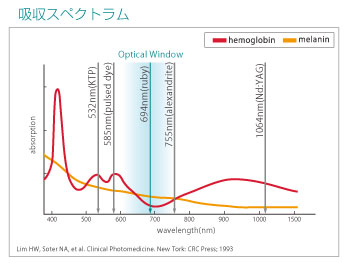 ルビーレーザーは、メラニン色素と酸化ヘモグロビンとの光吸収度の差が大きい「メラニン選択性の高い波長」で照射するため、より効果的にメラニン(シミ)に反応し、周囲組織へのダメージの少ない治療ができます。